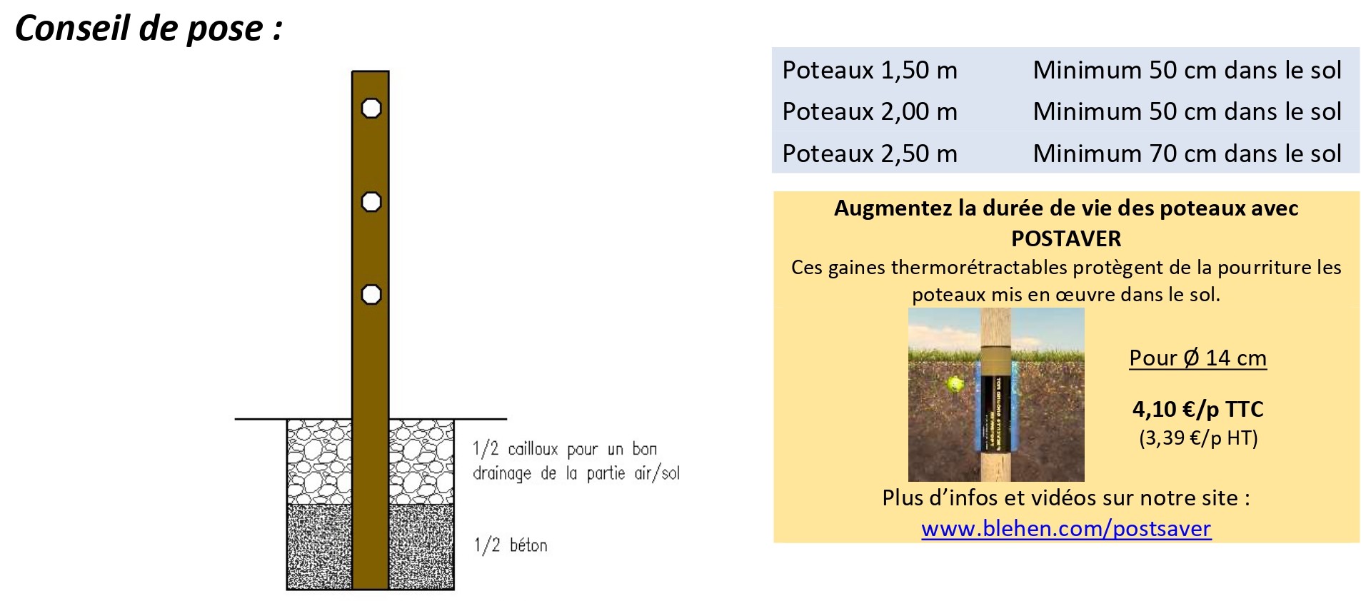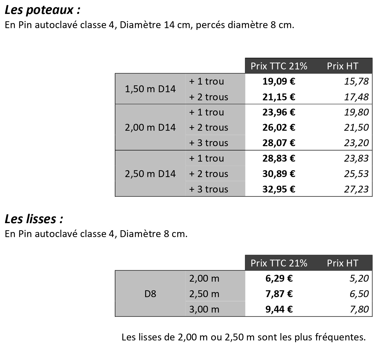Poteaux de diamètre 14 percés avec lisses emboitées diamètre 8 cm, En Pin traité en autoclave.