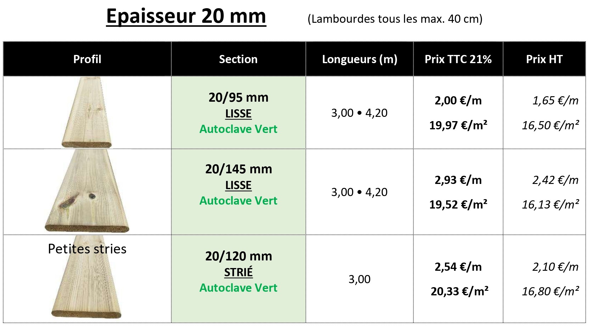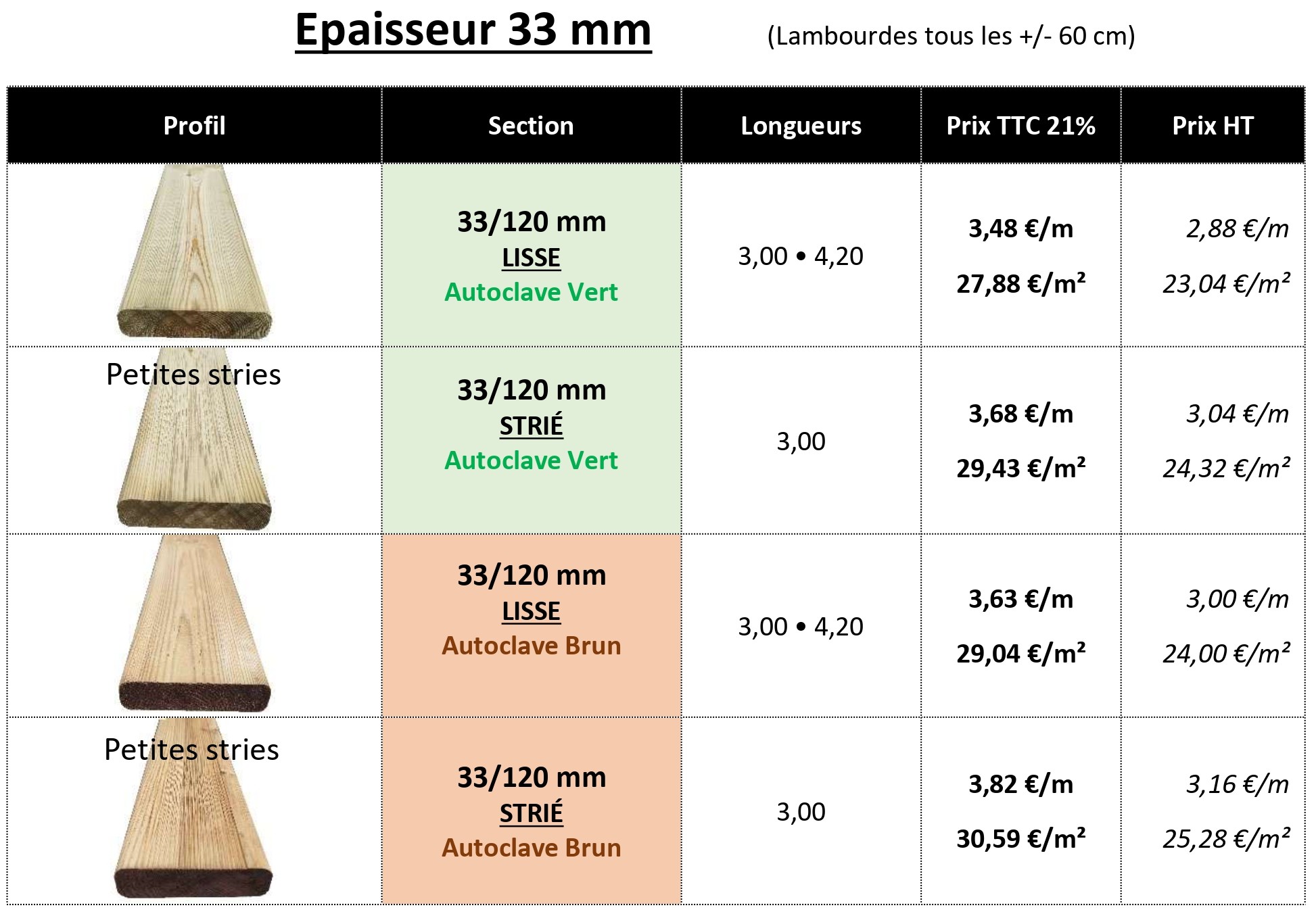 Nous proposons 2 épaisseurs : 20mm (écartement des lambourdes max. 40cm) et 33mm (écartement des lambourdes +/- 60cm).